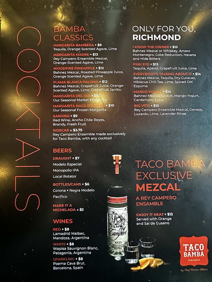 Desserts like the Churros and Chocolate Chip Churro Crunch Cookie provide a sweet finish to your meal. Each dish is crafted with care, showcasing not only the authenticity of Mexican cuisine but also the creativity that makes Taco Bamba stand out. With rave reviews highlighting the staff's vibrant service and flavorful dishes, Taco Bamba Richmond is a fresh dining experience that is sure to please locals and visitors alike.